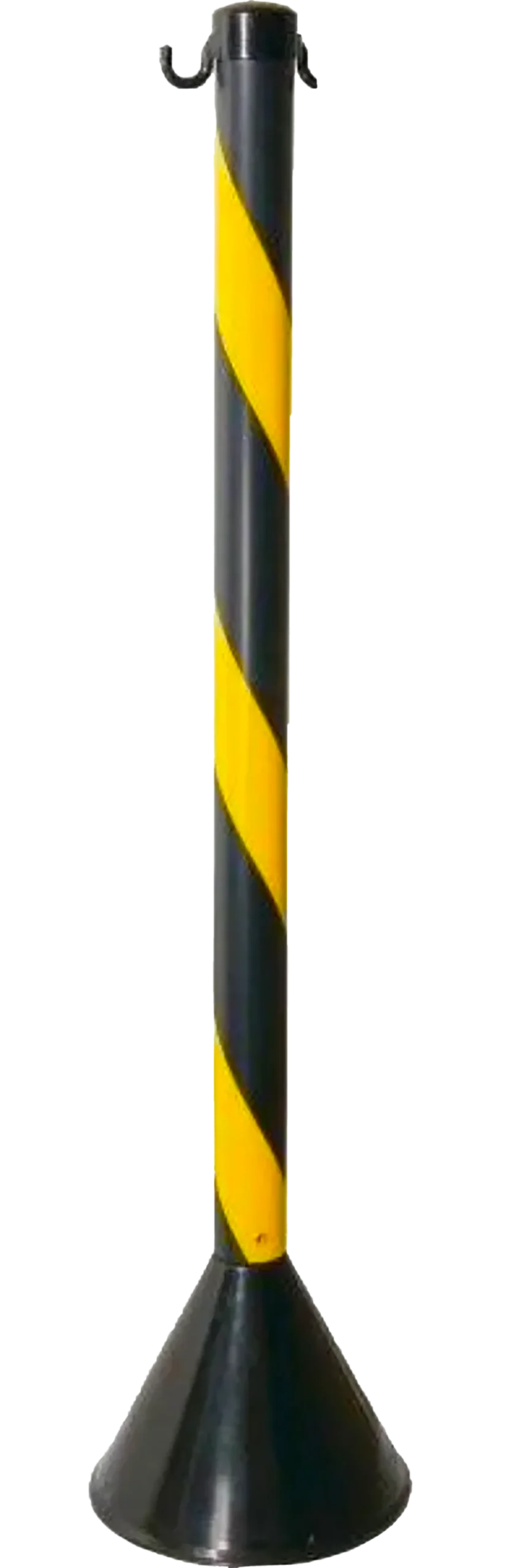 Pedestal para sinalização e segurança, confeccionado em três partes: base soprada em PP (polipropileno), tubo em PVC e tampa injetada em poliacetal, com dois ganchos opostos do mesmo material na tampa.